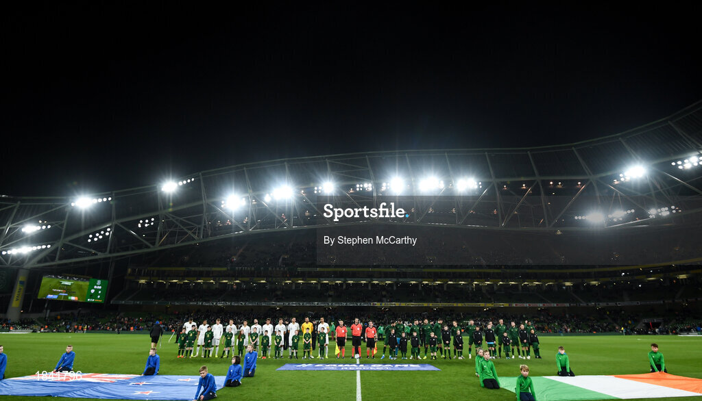 14 November 2019; Players and officials line up prior to the International Friendly match between Republic of Ireland and New Zealand at the Aviva Stadium in Dublin. Photo by Stephen McCarthy/Sportsfile