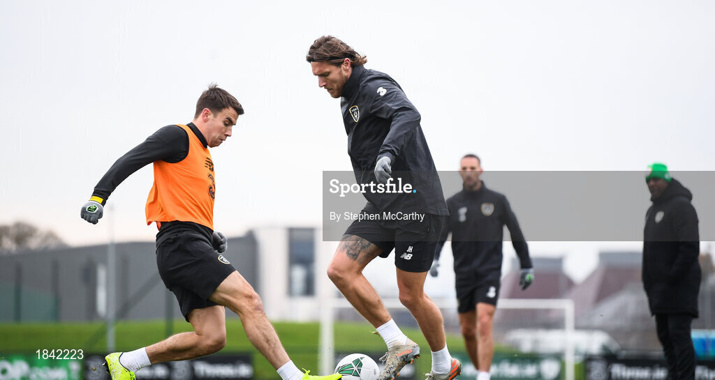 16 November 2019; Jeff Hendrick and Seamus Coleman, left, during a Republic of Ireland training session at the FAI National Training Centre in Abbotstown, Dublin. Photo by Stephen McCarthy/Sportsfile