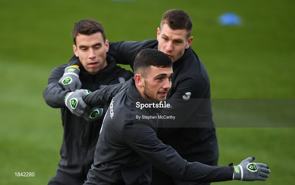 16 November 2019; Seamus Coleman, left, Troy Parrott and James Collins, right, during a Republic of Ireland training session at the FAI National Training Centre in Abbotstown, Dublin. Photo by Stephen McCarthy/Sportsfile