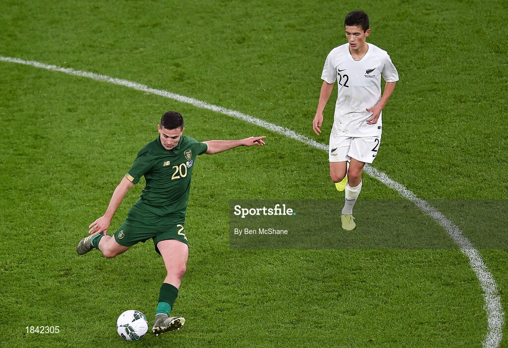 14 November 2019; Josh Cullen of Republic of Ireland and Elijah Just of New Zealand during the International Friendly match between Republic of Ireland and New Zealand at the Aviva Stadium in Dublin. Photo by Ben McShane/Sportsfile
