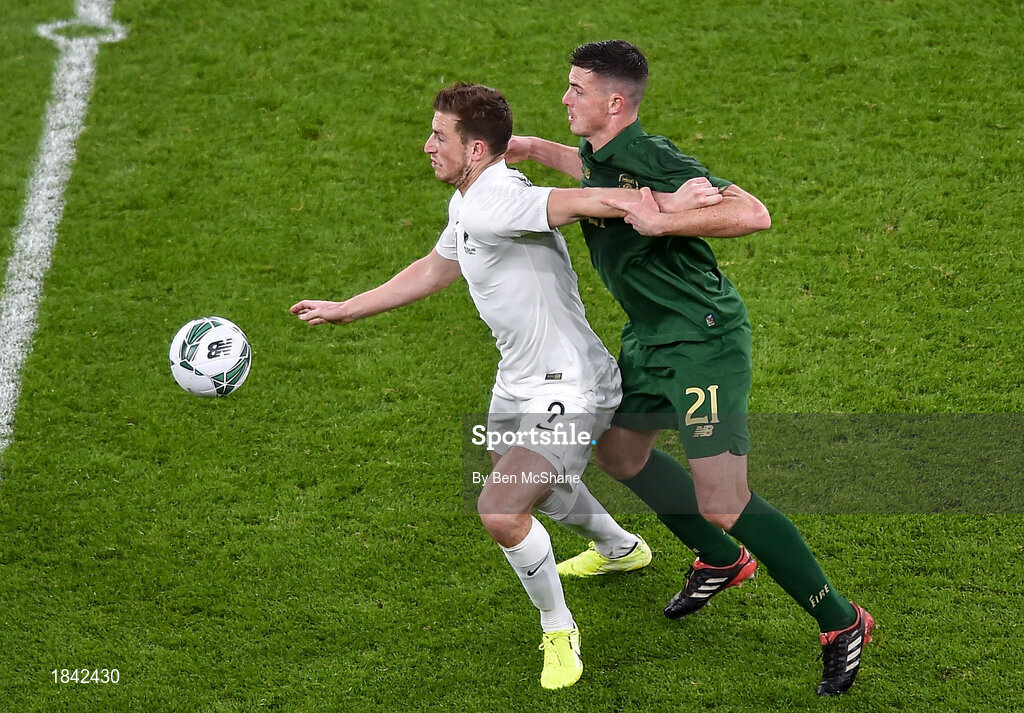14 November 2019; Chris Wood of New Zealand and Ciaran Clark of Republic of Ireland during the International Friendly match between Republic of Ireland and New Zealand at the Aviva Stadium in Dublin. Photo by Ben McShane/Sportsfile