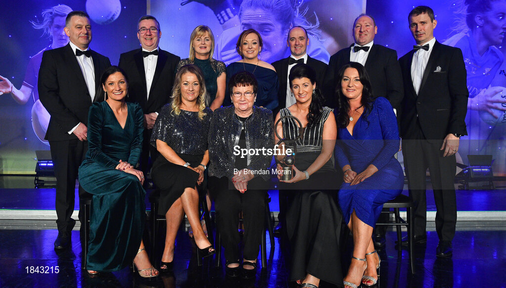 16 November 2019; Christina Heffernan of Mayo with her Hall of Fame award and her friends and family, back row, from left, Tony Melvin, Jimmy Heffernan, Geraldine Heffernan, Aisling Finnegan, Padraig Finnegan, Tom Malone and Ray Connelly, with, front, from left, Marcella Heffernan, Caroline Malone, Ann Heffernan, Christine Heffernan and Sarah Melvin, during the TG4 All-Ireland Ladies Football All Stars Awards banquet, in association with Lidl, at the Citywest Hotel in Saggart, Dublin. Photo by Brendan Moran/Sportsfile