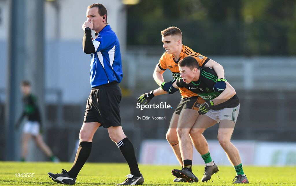 17 November 2019; Mark Cronin of Nemo Rangers with Dylan Casey of Austin Stacks during the AIB Munster GAA Football Senior Club Championship semi-final match between Nemo Rangers and Austin Stacks at Páirc Ui Rinn in Cork. Photo by Eóin Noonan/Sportsfile