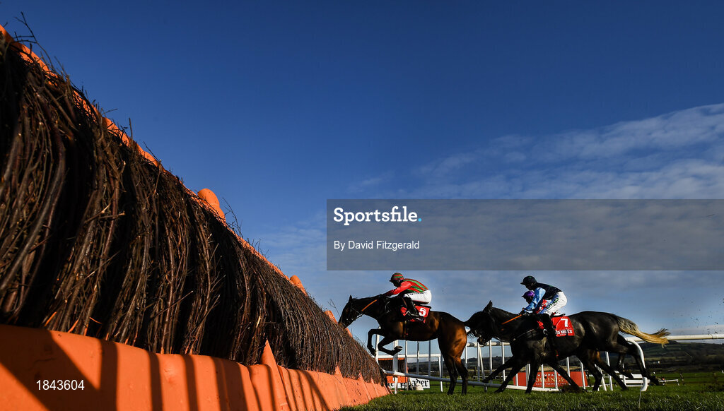 17 November 2019; Alpine Cobra, with Kevin Brouder up, left, jump the last on their way to winning the Connolly's RED MILLS Irish EBF Auction Maiden Hurdle at Punchestown Racecourse in Naas, Kildare. Photo by David Fitzgerald/Sportsfile