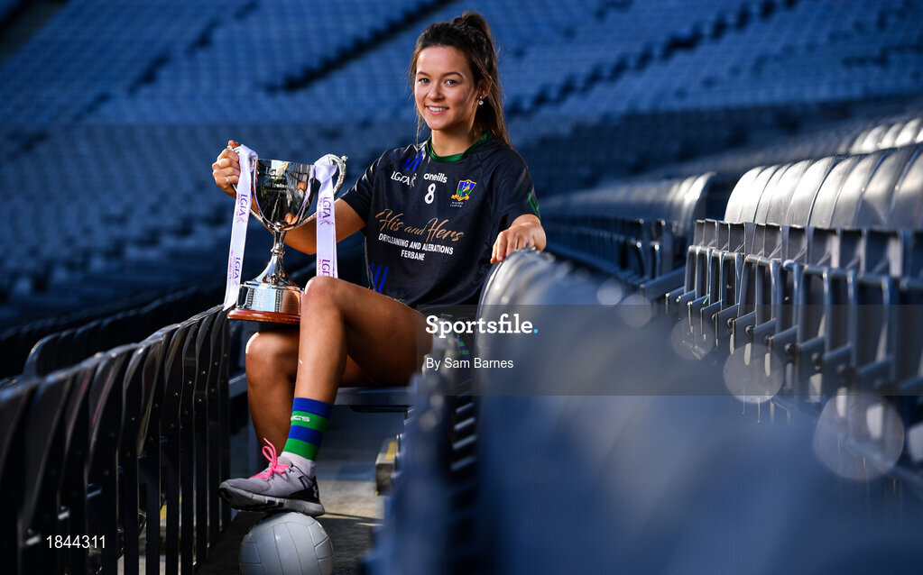 18 November 2019; Amy Gavin Mangan of Naomh Ciarán, with the Ladies All-Ireland Intermediate Club Trophy during LGFA All-Ireland Club Finals Captains Day at Croke Park in Dublin. Photo by Sam Barnes/Sportsfile