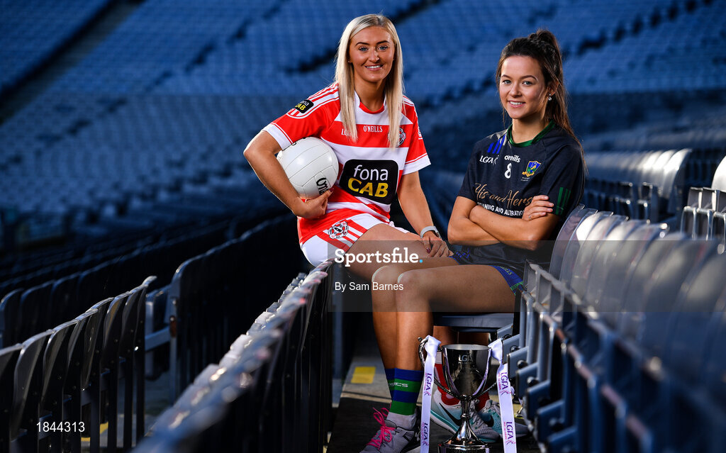 18 November 2019; Naomh Pól Captain Áine Tubridy, left, and Amy Gavin Mangan of Naomh Ciarán, with the Ladies All-Ireland Intermediate Club Trophy during LGFA All-Ireland Club Finals Captains Day at Croke Park in Dublin. Photo by Sam Barnes/Sportsfile