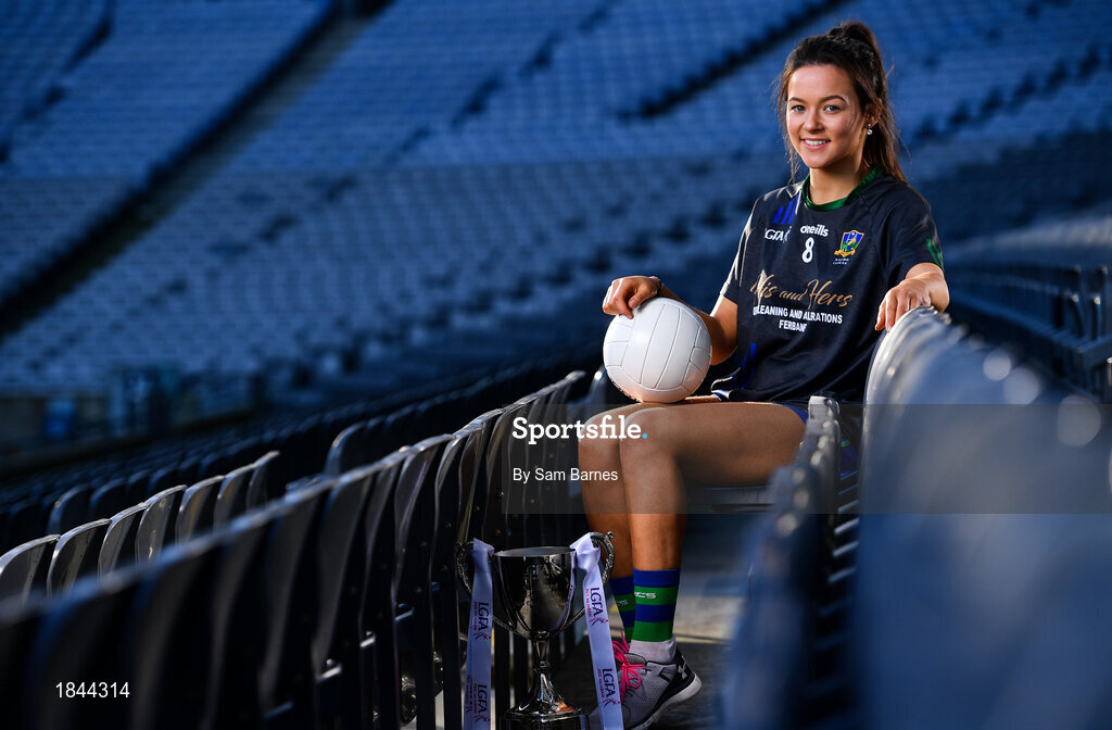 18 November 2019; Amy Gavin Mangan of Naomh Ciarán, with the Ladies All-Ireland Intermediate Club Trophy during LGFA All-Ireland Club Finals Captains Day at Croke Park in Dublin. Photo by Sam Barnes/Sportsfile