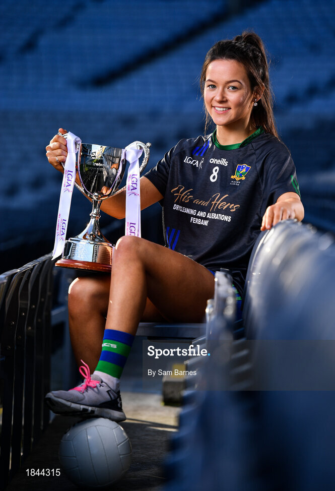 18 November 2019; Amy Gavin Mangan of Naomh Ciarán, with the Ladies All-Ireland Intermediate Club Trophy during LGFA All-Ireland Club Finals Captains Day at Croke Park in Dublin. Photo by Sam Barnes/Sportsfile