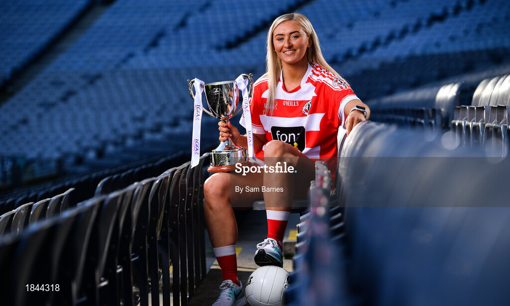 18 November 2019; Naomh Pól Captain Áine Tubridy with the Ladies All-Ireland Intermediate Club Trophy during LGFA All-Ireland Club Finals Captains Day at Croke Park in Dublin. Photo by Sam Barnes/Sportsfile