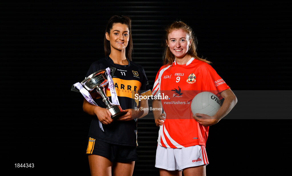 18 November 2019; Eimear Meaney of Mourneabbey, left, and Louise Ward, captain of Kilkerrin-Clonberne, with the Dolores Tyrrell Memorial Cup ahead of the Senior Ladies All-Ireland Club Final, during LGFA All-Ireland Club Finals Captains Day at Croke Park in Dublin. Photo by Sam Barnes/Sportsfile