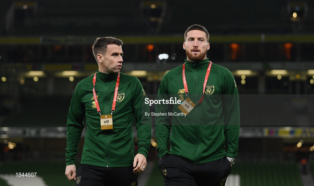 18 November 2019; Seamus Coleman, left and Matt Doherty of Republic of Ireland prior to the UEFA EURO2020 Qualifier match between Republic of Ireland and Denmark at the Aviva Stadium in Dublin. Photo by Stephen McCarthy/Sportsfile
