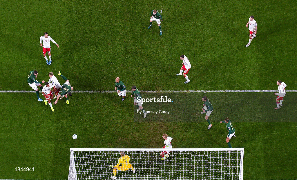 18 November 2019; Matt Doherty of Republic of Ireland heads his side's first goal during the UEFA EURO2020 Qualifier match between Republic of Ireland and Denmark at the Aviva Stadium in Dublin. Photo by Ramsey Cardy/Sportsfile