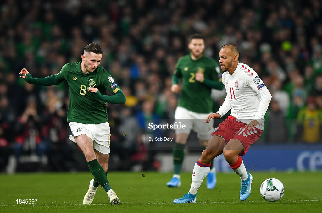 18 November 2019; Alan Browne of Republic of Ireland in action against Martin Braithwaite of Denmark during the UEFA EURO2020 Qualifier match between Republic of Ireland and Denmark at the Aviva Stadium in Dublin. Photo by Seb Daly/Sportsfile