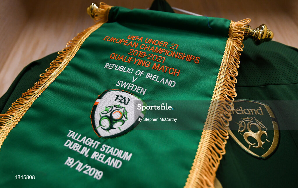 19 November 2019; The match pennant hangs in front of the jersey assigned to Republic of Ireland captain Jayson Molumby in their dressing room prior to the UEFA European U21 Championship Qualifier match between Republic of Ireland and Sweden at Tallaght Stadium in Tallaght, Dublin. Photo by Stephen McCarthy/Sportsfile