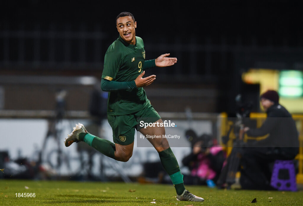 19 November 2019; Adam Idah of Republic of Ireland celebrates after scoring his side's second goal during the UEFA European U21 Championship Qualifier match between Republic of Ireland and Sweden at Tallaght Stadium in Tallaght, Dublin. Photo by Stephen McCarthy/Sportsfile