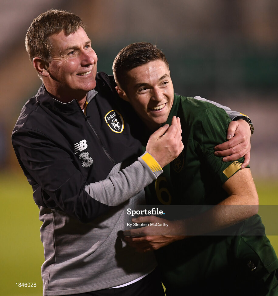 19 November 2019; Republic of Ireland manager Stephen Kenny and Conor Coventry of Republic of Ireland celebrate following the UEFA European U21 Championship Qualifier match between Republic of Ireland and Sweden at Tallaght Stadium in Tallaght, Dublin. Photo by Stephen McCarthy/Sportsfile