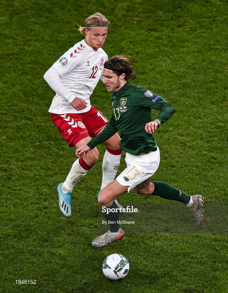 18 November 2019; Jeff Hendrick of Republic of Ireland and Kasper Dolberg of Denmark during the UEFA EURO2020 Qualifier - Group D match between Republic of Ireland and Denmark at Aviva Stadium in Dublin. Photo by Ben McShane/Sportsfile
