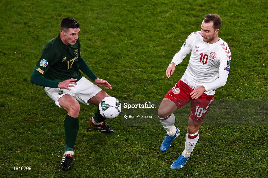 18 November 2019; Christian Eriksen of Denmark and Ciaran Clark of Republic of Ireland during the UEFA EURO2020 Qualifier - Group D match between Republic of Ireland and Denmark at Aviva Stadium in Dublin. Photo by Ben McShane/Sportsfile