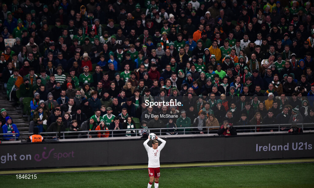 18 November 2019; Jens Stryger Larsen of Denmark prepares to take a throw-in during the UEFA EURO2020 Qualifier - Group D match between Republic of Ireland and Denmark at Aviva Stadium in Dublin. Photo by Ben McShane/Sportsfile
