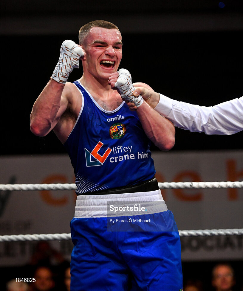 22 November 2019; Emmett Brennan of Docklands, Co Dublin, celebrates beating Thomas O’Toole of Celtic Eagles, Co Galway, in their 81kg bout during the IABA Irish National Elite Boxing Championships Finals at the National Stadium in Dublin. Photo by Piaras Ó Mídheach/Sportsfile