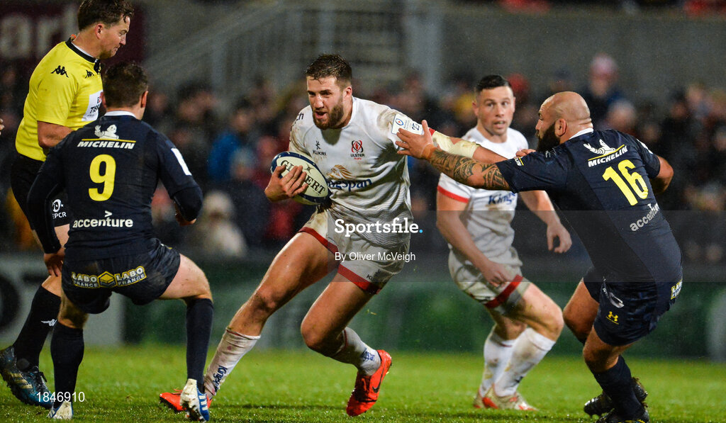22 November 2019; Stuart McCloskey of Ulster in action against Greig Laidlaw and Mike Tadjer of ASM Clermont Auvergne during the Heineken Champions Cup Pool 3 Round 2 match between Ulster and ASM Clermont Auvergne at Kingspan Stadium in Belfast. Photo by Oliver McVeigh/Sportsfile