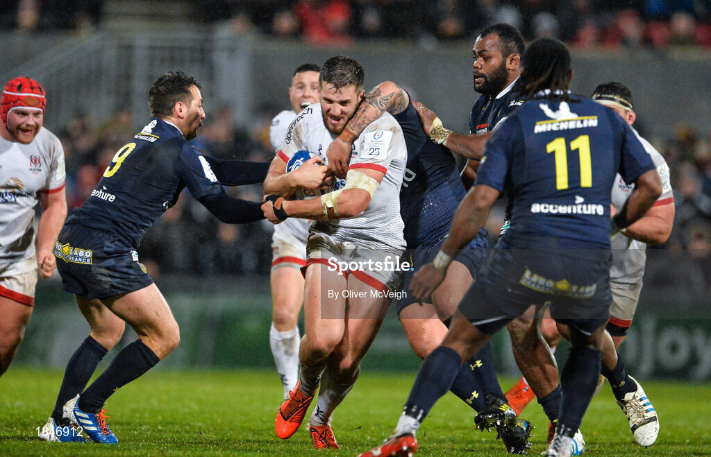 22 November 2019; Stuart McCloskey of Ulster in action against Greig Laidlaw and Mike Tadjer of ASM Clermont Auvergne during the Heineken Champions Cup Pool 3 Round 2 match between Ulster and ASM Clermont Auvergne at Kingspan Stadium in Belfast. Photo by Oliver McVeigh/Sportsfile