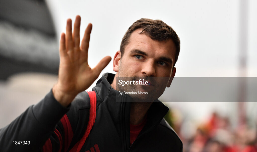 23 November 2019; Tadhg Beirne of Munster waves to fans on arrival prior to the Heineken Champions Cup Pool 4 Round 2 match between Munster and Racing 92 at Thomond Park in Limerick. Photo by Brendan Moran/Sportsfile