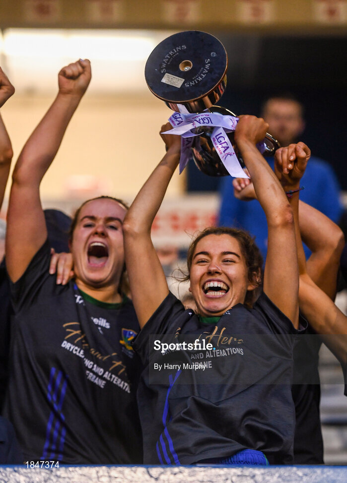 23 November 2019; Eimear Flynn of Naomh Ciaran lifts the trophy following the All-Ireland Ladies Intermediate Club Championship Final match between Naomh Ciaran and Naomh Pól at Kingspan Breffni in Cavan. Photo by Harry Murphy/Sportsfile