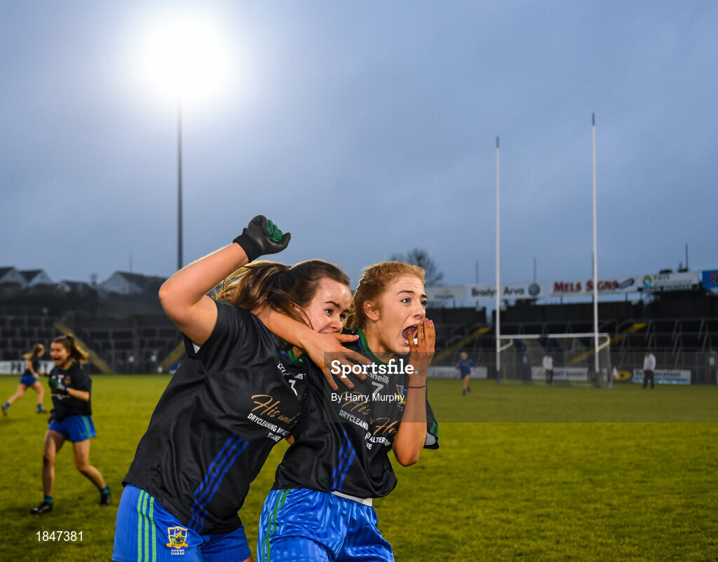 23 November 2019; Emer Nally, left, and Ffion Boland of Naomh Ciaran react at the full-time whistle following the All-Ireland Ladies Intermediate Club Championship Final match between Naomh Ciaran and Naomh Pól at Kingspan Breffni in Cavan. Photo by Harry Murphy/Sportsfile