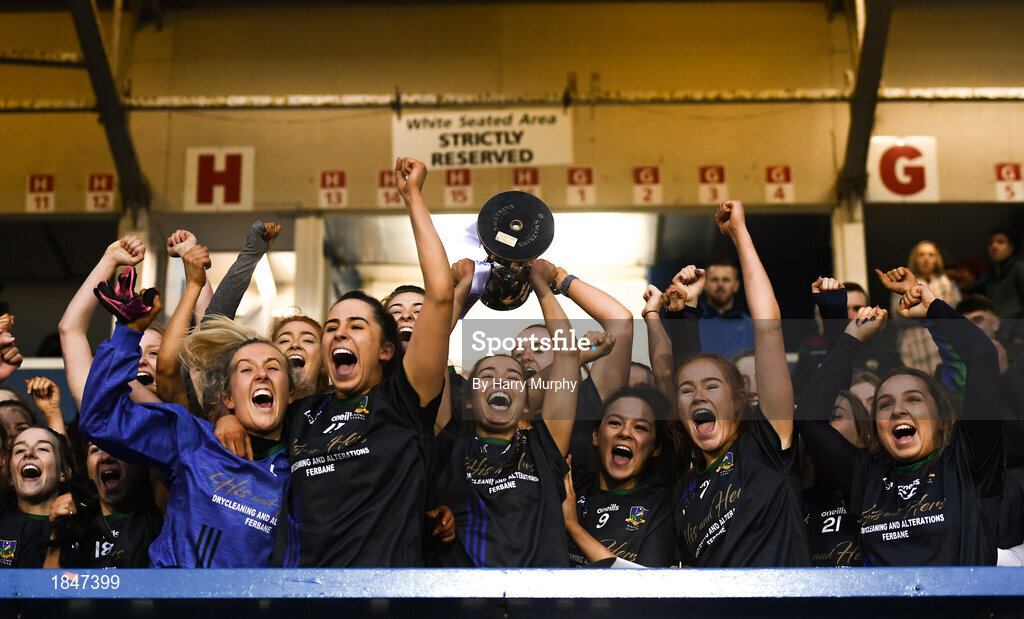 23 November 2019; Eimear Flynn of Naomh Ciaran lifts the trophy following the All-Ireland Ladies Intermediate Club Championship Final match between Naomh Ciaran and Naomh Pól at Kingspan Breffni in Cavan. Photo by Harry Murphy/Sportsfile