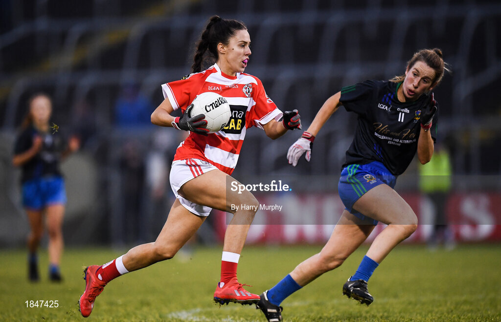 23 November 2019; Naoishe Burns of Naomh Pól in action against Lorraine Keena of Naomh Ciaran during the All-Ireland Ladies Intermediate Club Championship Final match between Naomh Ciaran and Naomh Pól at Kingspan Breffni in Cavan. Photo by Harry Murphy/Sportsfile