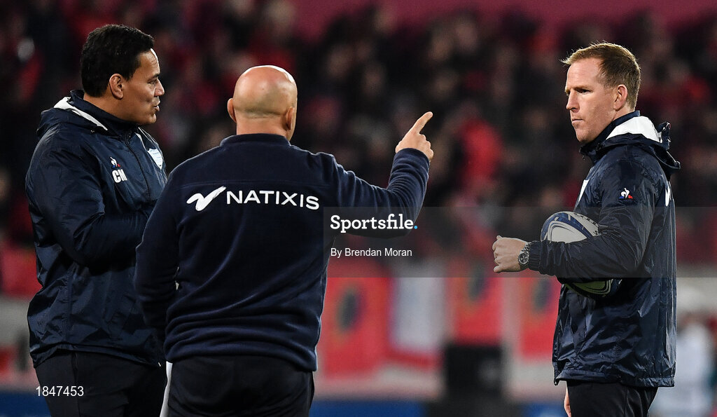 23 November 2019; Racing 92 backs coach Mike Prendergast, right, with Director of Rugby Laurent Travers and skills coach Chris Masoe prior to the Heineken Champions Cup Pool 4 Round 2 match between Munster and Racing 92 at Thomond Park in Limerick. Photo by Brendan Moran/Sportsfile