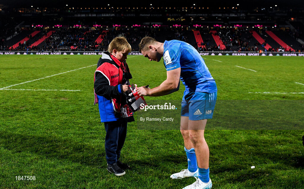 23 November 2019; Jordan Larmour of Leinster signs an autograph following the Heineken Champions Cup Pool 1 Round 2 match between Lyon and Leinster at Matmut Stadium in Lyon, France. Photo by Ramsey Cardy/Sportsfile