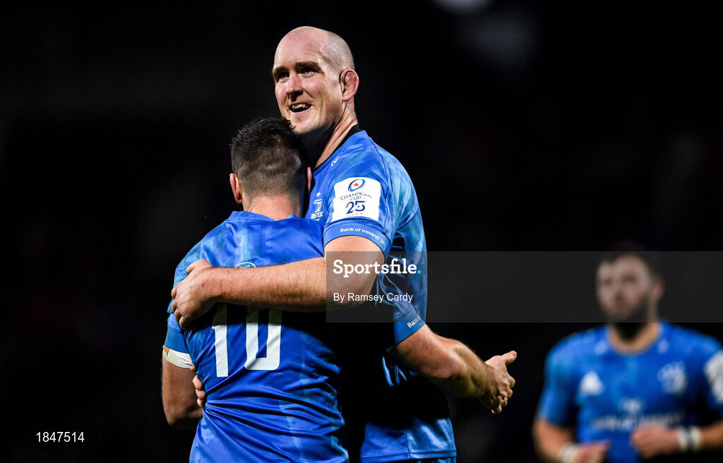 23 November 2019; Devin Toner, right, and Jonathan Sexton celebrate a try which was subsequently disallowed during the Heineken Champions Cup Pool 1 Round 2 match between Lyon and Leinster at Matmut Stadium in Lyon, France. Photo by Ramsey Cardy/Sportsfile