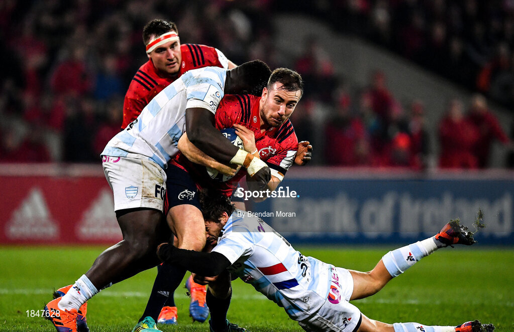 23 November 2019; JJ Hanrahan of Munster is tackled by Cedate Gomes Sa, left, and Teddy Iribaren of Racing 92 during the Heineken Champions Cup Pool 4 Round 2 match between Munster and Racing 92 at Thomond Park in Limerick. Photo by Brendan Moran/Sportsfile