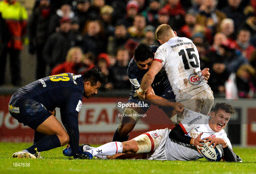 22 November 2019; Billy Burns of Ulster in action against Peter Betham of ASM Clermont Auvergne during the Heineken Champions Cup Pool 3 Round 2 match between Ulster and ASM Clermont Auvergne at Kingspan Stadium in Belfast. Photo by Oliver McVeigh/Sportsfile