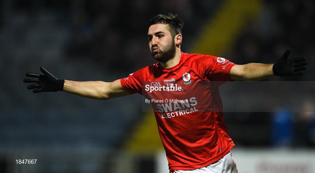 23 November 2019; Christopher Blake of Éire Óg celebrates scoring his side's first goal during the AIB Leinster GAA Football Senior Club Championship Semi-Final match between Portlaoise and Éire Óg at MW Hire O’Moore Park in Portlaoise, Co Laois. Photo by Piaras Ó Mídheach/Sportsfile