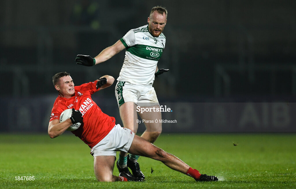 23 November 2019; Jordan Morrissey of Éire Óg in action against Ciarán McEvoy of Portlaoise during the AIB Leinster GAA Football Senior Club Championship Semi-Final match between Portlaoise and Éire Óg at MW Hire O’Moore Park in Portlaoise, Co Laois. Photo by Piaras Ó Mídheach/Sportsfile