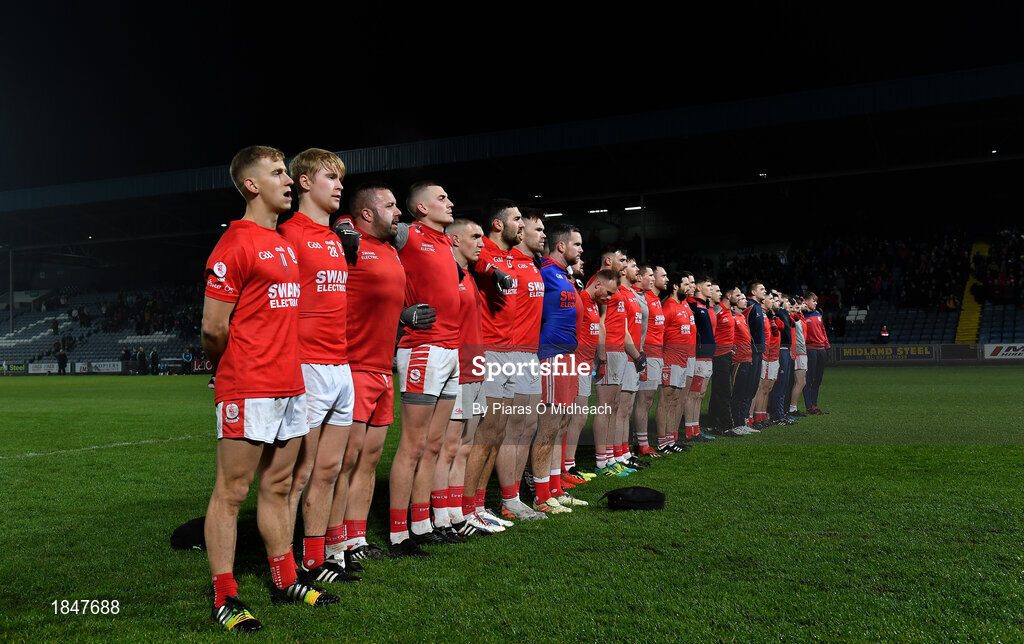 23 November 2019; Éire Óg players stand for Amhrán na bhFiann before the AIB Leinster GAA Football Senior Club Championship Semi-Final match between Portlaoise and Éire Óg at MW Hire O’Moore Park in Portlaoise, Co Laois. Photo by Piaras Ó Mídheach/Sportsfile