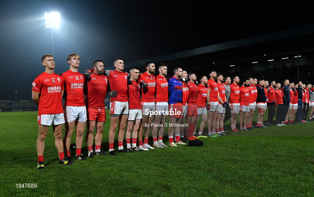 23 November 2019; Éire Óg players stand for Amhrán na bhFiann before the AIB Leinster GAA Football Senior Club Championship Semi-Final match between Portlaoise and Éire Óg at MW Hire O’Moore Park in Portlaoise, Co Laois. Photo by Piaras Ó Mídheach/Sportsfile