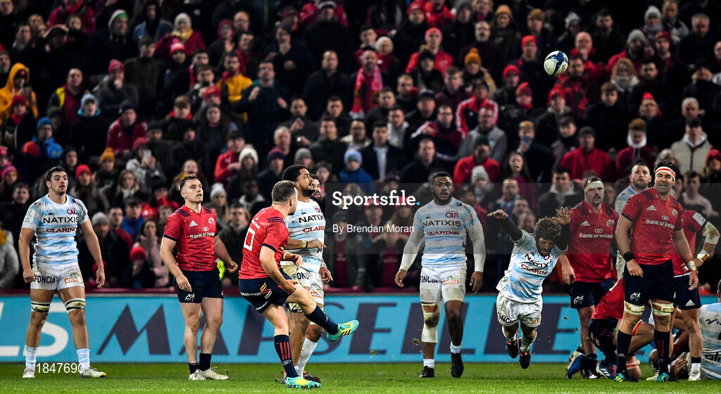 23 November 2019; JJ Hanrahan of Munster attempts a drop goal late in the game during the Heineken Champions Cup Pool 4 Round 2 match between Munster and Racing 92 at Thomond Park in Limerick. Photo by Brendan Moran/Sportsfile