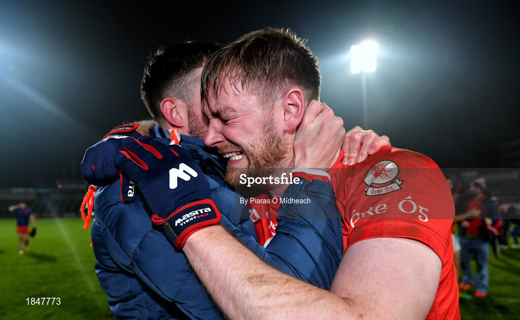 23 November 2019; Paul McElligott of Éire Óg celebrates with Cian Clancy, left, after the AIB Leinster GAA Football Senior Club Championship Semi-Final match between Portlaoise and Éire Óg at MW Hire O’Moore Park in Portlaoise, Co Laois. Photo by Piaras Ó Mídheach/Sportsfile