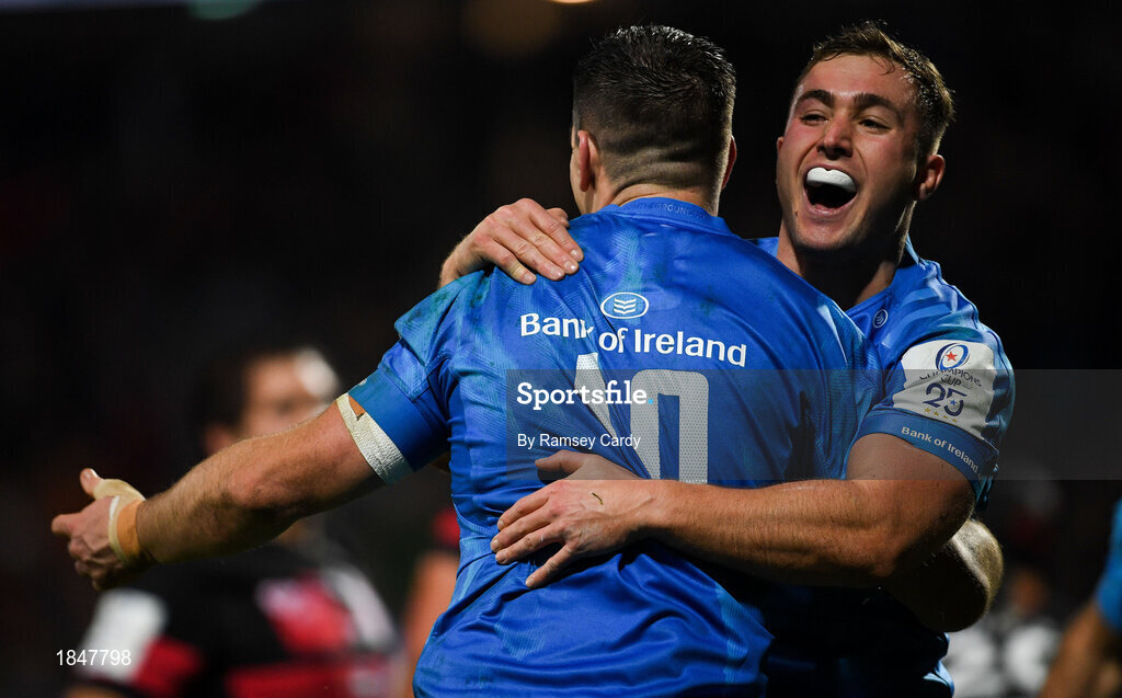 23 November 2019; Jordan Larmour, right, celebrates a try with Leinster team-mate Jonathan Sexton during the Heineken Champions Cup Pool 1 Round 2 match between Lyon and Leinster at Matmut Stadium in Lyon, France. Photo by Ramsey Cardy/Sportsfile