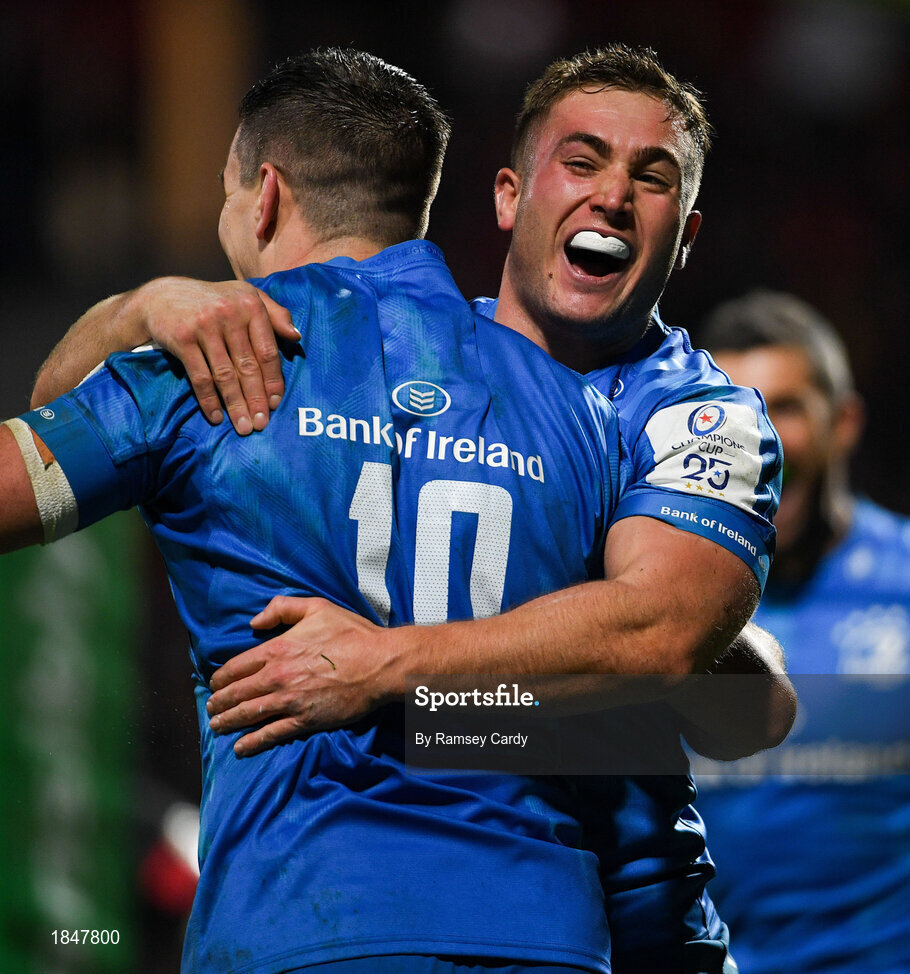 23 November 2019; Jordan Larmour, right, celebrates a try with Leinster team-mate Jonathan Sexton during the Heineken Champions Cup Pool 1 Round 2 match between Lyon and Leinster at Matmut Stadium in Lyon, France. Photo by Ramsey Cardy/Sportsfile