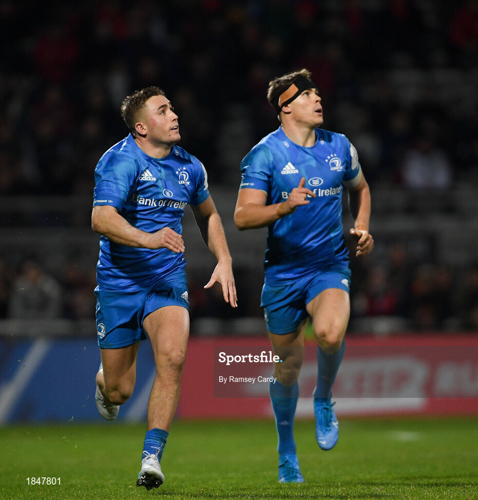 23 November 2019; Jordan Larmour, left, and Garry Ringrose of Leinster during the Heineken Champions Cup Pool 1 Round 2 match between Lyon and Leinster at Matmut Stadium in Lyon, France. Photo by Ramsey Cardy/Sportsfile