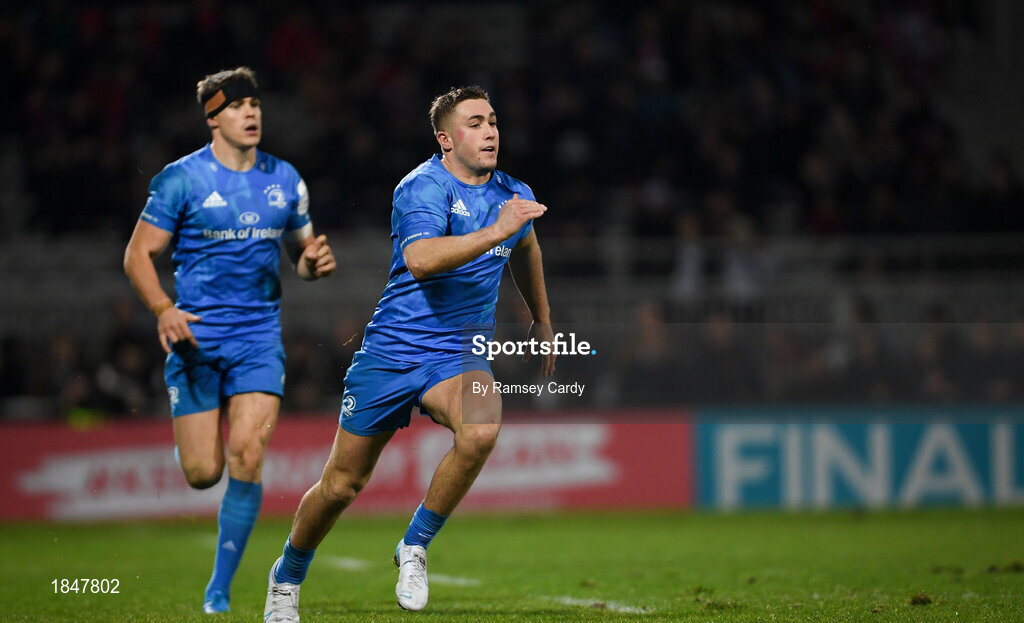 23 November 2019; Jordan Larmour, left, and Garry Ringrose of Leinster during the Heineken Champions Cup Pool 1 Round 2 match between Lyon and Leinster at Matmut Stadium in Lyon, France. Photo by Ramsey Cardy/Sportsfile