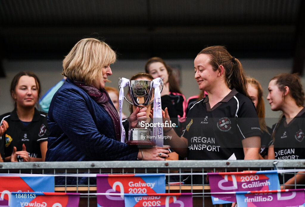 24 November 2019; Eileen Lyons of Donoughmore receives the Cup from Marie Hickey, LGFA President, following the All-Ireland Ladies Junior Club Championship Final match between Donoughmore and MacHale Rovers at Duggan Park in Ballinasloe, Co Galway. Photo by Harry Murphy/Sportsfile