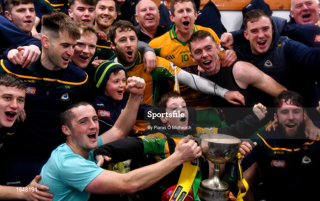 24 November 2019; Corofin supporter Tomás McLoughlin, age 9, celebrates with the players in the dressing room after the AIB Connacht GAA Football Senior Club Football Championship Final match between Corofin and Pádraig Pearses at Tuam Stadium in Tuam, Galway. Photo by Piaras Ó Mídheach/Sportsfile