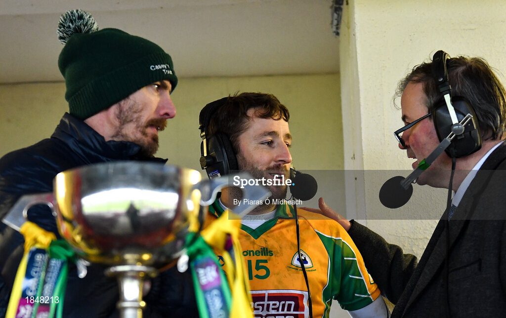 24 November 2019; Corofin captain Micheál Lundy is interviewed on RTÉ radio by Brian Carthy, right, alongside analyst John Casey after the AIB Connacht GAA Football Senior Club Football Championship Final match between Corofin and Pádraig Pearses at Tuam Stadium in Tuam, Galway. Photo by Piaras Ó Mídheach/Sportsfile