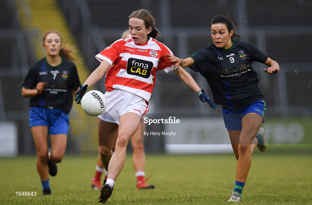 23 November 2019; Caoimhe Stewart of Naomh Pól in action against Amy Gavin Mangan of Naomh Ciaran during the All-Ireland Ladies Intermediate Club Championship Final match between Naomh Ciaran and Naomh Pól at Kingspan Breffni in Cavan. Photo by Harry Murphy/Sportsfile